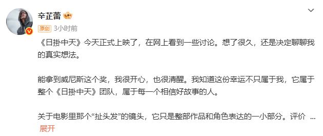 之后,辛芷蕾发文回应《日掛中天》争议,她表示电影中“扯头发”的镜头只是小部分,希望大家去了解全貌。关于奖项运作争议,辛芷蕾称不知道谁来运作,可以运作的话为何自己14年才拿到影后,文章最后,辛芷蕾表示“奖杯我会好好收着”。